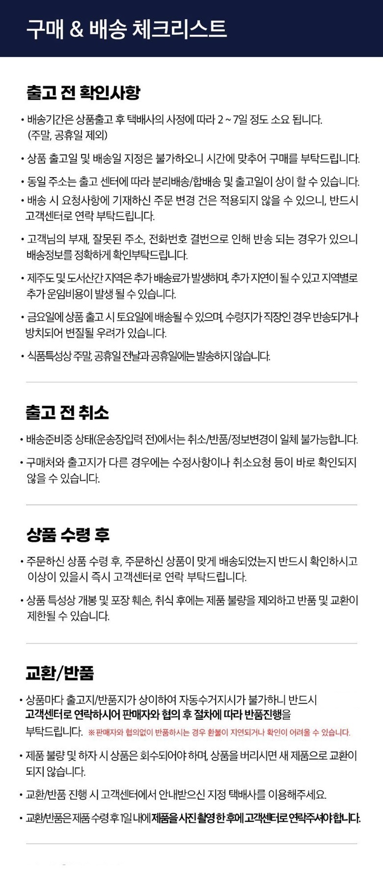 상품상세설명에 배송/교환/반품/취소 관련 안내가 기재된 경우 다음 안내사항보다 우선 적용됩니다.