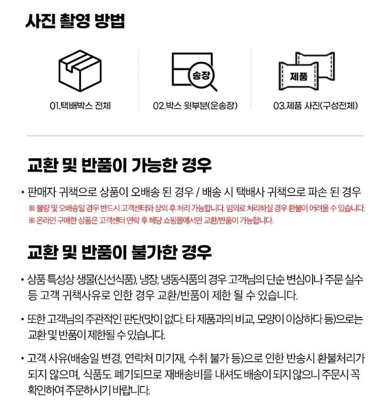 • 신선식품의 경우 재판매가 불가능한 제품 특성상 단순변심 및 개인적 입맛 차이로 인한 반품은 불가능하며 제품 수령 후 문제가 있는 경우 이상부분 사진 촬영하여 수령하신 날짜 기준 2일 이내 연락해주셔야합니다.(기일은 업체별 상이할 수 있으니 수령즉시 연락 부탁드리겠습니다.)